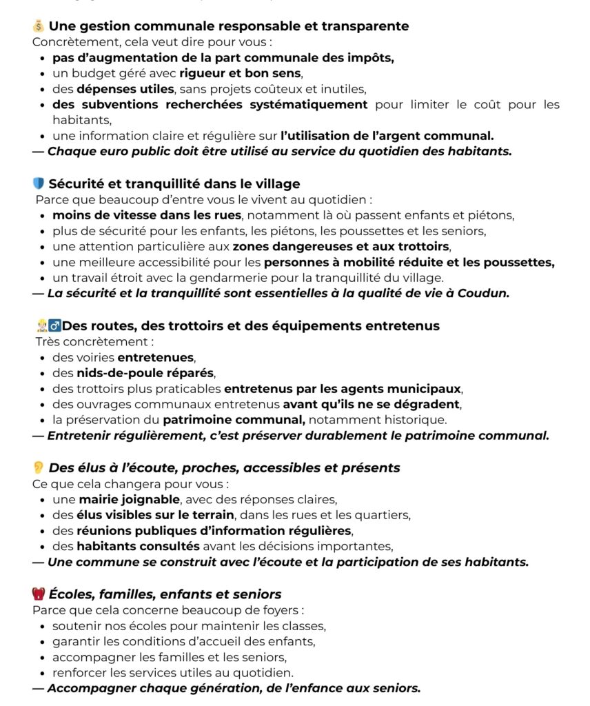 Ces priorités sont le résultat des échanges que nous avons eus avec de nombreux Coudunoises et Coudunois. Elles traduisent notre volonté d’agir concrètement pour améliorer la vie quotidienne dans notre village.